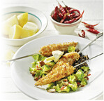 16 Hähnchenbrustinnenfilets 1 Brokkoli 30 g Ingwer 1 Chilischote 1 Apfel 40 g Mandeln 3-4 EL Olivenöl Saft von einer Zitrone 1 TL Honig 1 ½ TL Senf Salz und Pfeffer 150 g Wildreis 2 Eier 100 g Kokosraspeln 3 EL Rapsöl