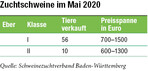 Der Schweinemarkt zeigte sich im Mai angespannt mit sinkenden Preisen, geschuldet auch der Corona-Lage. Durch eine gleichbleibende Nachfrage in Export, Ferkelerzeugung und Besamung sowie ein sehr hochwertiges Angebot der Zuchtbetriebe blieben die Verkaufszahlen der Eber im Mai im Vergleich zum April stabil. Insgesamt wurden von den badenwürttembergischen Züchtern 66 Jungeber zum Durchschnittspreis von 1205 Euro verkauft. Knapp ein Drittel davon ging in andere Bundesländer, nach Spanien und Frankreich. In Klasse I wurden 56 Tiere bewertet und verkauft; durchweg stressnegativ und mit gesicherten genomischen Zuchtwerten. Eber der Deutschen Landrasse wurden im Mai deutlich mehr vermarktet. Die Spitzeneber kamen aus der Zucht Klaus und Philipp...