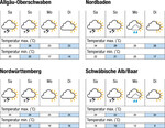 Der Samstag wird sonnig und heiß. Zum Abend zieht – mit auffrischendem Wind – Bewölkung auf und es sind lokale Gewitterschauer möglich. Die Temperaturen erreichen bis zu 33°C im Rheintal, 35°C im Neckarraum und 22°C auf der Alb. Der Sonntag wird meist bewölkt und es muss mit zahlreichen Gewitterschauern gerechnet werden. Die Temperaturen liegen bei bis zu 29°C im Rheintal, 27°C im Neckarraum und 22°C auf der Alb. Der Montag wird bei auffrischendem Nordwestwind meist dicht bewölkt mit lokalen Niederschlägen. Das Thermometer zeigt maximal 25°C in den Ebenen und 20°C auf der Alb. Der Dienstag wird voraussichtlich mäßig bis dicht bewölkt, bei bis zu 26°C in den Ebenen und 19°C auf der Alb. Die Folgetage werden wohl wechselhaft, bei steigenden...