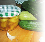 Für 4 Gläser je 400 ml: 2 kg reife gelbe, noch feste Gurken | 1 Zwiebel | 2 EL Salz 400 ml Essig/Apfelessig | 100 ml Zitronensaft | 500 g Zucker oder Honig Senfkörner | Dill | Lorbeerblätter | Pfefferkörner