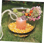 Windlichter bringen eine gemütliche herbstliche Stimmung ins Haus. Benötigt werden hierfür: ein schönes Glas (Windlicht), Maiskolben, Schnur, Kerze, Myrtendraht und gesammelte Früchte. Zuerst die Maiskörner vom Kolben entfernen. Sie werden dann in das Glas gefüllt. Darauf wird eine Kerze platziert. Mit einer Kordel wird der Umfang des Glases ausgemessen. Zum Umfang kommt eine Zugabe von zirka 30 Zentimeter für eine Schleife hinzu. Auf die Kordel werden dann mit dem dünnen Myrtendraht Blüten von Hortensien und wilder Möhre, Hagebutten und sonstige Schätze aufgebunden. Es kann nur ein kurzes Stück gebunden werden, dann ist das Glas nur auf einer Seite geschmückt, oder rundherum. Die Schnurr wird nun um das Glas geknotet und am Ende eine...