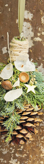 Aus einfachen Zapfen lässt sich mit wenig Aufwand wunderschöner Schmuck für die Haustüre oder das Fenster basteln. Benötigt werden: größere Zapfen nach Wahl (Pinienzapfen eignen sich besonders gut), Band, Draht, Kordel, Schmucksterne und etwas Konifere, gerne gemischt. An der Oberseite des Zapfens wird zwischen den Schuppen ein Draht durchgefädelt und mit einem Seitenschneider zusammengedreht. Unter den Draht wird anschließend ein Band durchgefädelt und verknotet. Dieses dient am Ende als Aufhänger. An die hochgebogenen Drähte wird nun verschiedenes Koniferengrün eng um den Zapfen angelegt und mit Wickeldraht festgebunden. Die Stiele des Grüns werden gleichmäßig abgeschnitten, das Ende mit einer Naturkordel abgewickelt und schließlich...