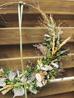 Die zart umwickelten Drahtringe sind ein echter Blickfang. Benötigt werden: Metallring in Gold, Wickeldraht, Moos, Islandmoos, Buchsbaum, Gräser, Steineiche oder Konifere, etwas Heu und Band. Die Naturmaterialien werden entweder selbst gesammelt oder im Floristikgeschäft erworben. Als erstes wird der Draht am Ring befestigt. Die untere Hälfte umwickelt man mit etwas Heu. Auf einer Seite wird nun im oberen Bereich mit Gräsern begonnen. In kleinen Bündeln wird nun nach und nach das Material abwechselnd aufgebunden – nach unten etwas breiter werdend. In der Mitte angekommen, geht es an die andere Seite. Hier geht man exakt genauso vor. Jetzt noch die Lücke schließen. Dafür drahtet man Zweige von Bux oder Konifere an und schiebt sie in die...