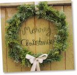 Der filigrane Kranz kann selbstverständlich auch rundum gewickelt werden. Ganz schlicht, nur mit gemischtem Konifeerengrün gebunden, kommt er mit einem Schriftzug gut zur Wirkung. Benötigt werden: ein Drahtring, gemischtes Koniferengrün, Schmuckdraht zum Binden, Aluminiumdraht und Band. Das Koniferengrün wird in kleine Stücke geschnitten und bereitgelegt. Es werden keine großen Bündel, wie man es bei der üblichen Kranzbindetechnik gewohnt ist, aufgebunden, sondern eher einzelne Abschnitte mit dünnem Draht auf den Ring gewickelt. So erhält man „automatisch" die feine, dünne Form. Da die Mitte dadurch groß ist, lässt sie uns viel Gestaltungsfreiraum. So kann man mit etwas Geschick aus Aluminiumdraht einen Schriftzug formen und an den Seiten...