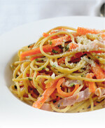400 g Vollkorn-Spaghetti | Salz | 600 g Karotten Olivenöl | Gemüsebrühe (gekörnt) | 200 ml Milch (3,5 % Fett) | 2 Zweige Estragon | ein paar Blätter Zitronenmelisse | 2 EL Frischkäse | 40 g geriebener Parmesankäse | 200 g gekochter Schinken Pfeffer, Kräutersalz