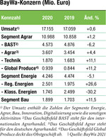 Der Umsatz des Münchner Handelsunternehmens stieg – wie erwartet – moderat auf 17,2 (2019: 17,1) Mrd. Euro. Das Ergebnis vor Zinsen und Steuern (EBIT) war mit 215,2 (188,4) Mio. Euro besser als geplant. Nach diesen Angaben trugen alle Segmente zum Unternehmenserfolg bei. Die Dividende für 2020 soll um fünf Cent auf 1,00 Euro je Aktie steigen. Breit aufgestellter Grundversorger „Als Grundversorger ist die BayWa ein breit aufgestelltes, international tätiges Unternehmen und sehr erfolgreich in zukunftsorientierten Geschäftsfeldern wie regenerative Energien tätig. Auch in der Coronakrise steht die BayWa deshalb nicht nur stabil und solide da, sondern kann sogar noch zulegen", sagt Klaus Josef Lutz, der Vorstandsvorsitzende der...
