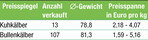 Der Markt am 7. Januar konnte mit einem mengenmäßig durchschnittlichen Angebot aufwarten. Bei den weiblichen Kälbern befanden sich nur 13 Kälber im Angebot, so dass nicht jeder Kaufwunsch erfüllt werden konnte. Mit 2,77 Euro pro kg zog der Preis etwas an. Der Auftrieb der Bullenkälber war von vielen Ausfällen geprägt. Die angebotenen Kälber konnten jedoch zügig an neue Besitzer zugeschlagen werden. Besonders gefragt waren frische Kälber ab 65 kg mit ausgeprägten Masteigenschaften. Erlöst wurden 4,47 Euro pro kg, was bei 81 kg Schnittgewicht einem Kopfpreis von 363 Euro entspricht.