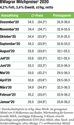 Der BWagrar Milchpreis für konventionelle Milch ist im Dezember gegenüber November 2020 um 0,1 Cent auf 34,5 Cent pro kg gestiegen. Der BWagrar Bio-Milchpreis erhöhte sich um 0,1 Cent auf 51,3 Cent (gewichtet). Wie die ZMB Anfang Januar meldet, stieg die Milchanlieferung in der 51. Woche in Deutschland weiter saisonal an. Die Molkereien erfassten 1,1 Prozent mehr Milch als in der Vorwoche. Der Rückstand zum Vorjahresniveau lag damit bei 1,1 Prozent. Die Nachfrage nach flüssigem Rohstoff verlief Ende 2020 und über den Jahreswechsel für diese Zeit des Jahres vergleichsweise rege und überstieg teils sogar das verfügbare Angebot. Die Preise sowohl für Magermilchkonzentrat wie auch für Industrierahm waren ungewöhnlich stabil. Die Notierung für...