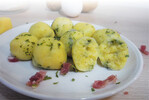 Zutaten 1 x Grundrezept Kartoffelteig, für die Füllung 1 - 2 Brötchen Butter oder Öl Zubereitung Brötchen in kleine Würfel schneiden, in Fett hellbraun rösten, abkühlen lassen. Teig in 12 Teile teilen, mit bemehlten Händen jeweils etwas plattdrücken, Brotwürfelchen darauflegen, schließen und zum Knödel formen. Erst Probekloß in siedendem Salzwassser kochen. Ist der Teig zu weich, etwas Mehl oder Grieß zugeben, erst dann restliche Knödel formen und etwa 10 Min. garen (bei 8 Knödeln 15 - 20 Min.) Sehr kleine Knödel eignen sich als Suppeneinlage. Als Topping Semmelbrösel in Butter bräunen und über die Knödel geben. Als Füllung eignen sich auch Hackfleisch, Pilze, Speck oder Käse. Zum Einfrieren gut abtropfen lassen, abgekühlt vorgefrieren,...