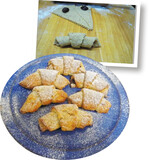 Zutaten (24 Stück) 250 g gegarte, durchgedrückte mehlige Kartoffeln | Salz | 300 g Mehl 1 Päck. Backpulver | 80 g Zucker | 1 Prise Salz | 2 Eier | 75 g Butter 75 g geriebene Walnüsse. Fülle: rote Marmelade; zum Bestreichen 1 Eigelb und 2 EL Milch Zubereitung: Mürbteig herstellen, zugedeckt 30 Min. im Kühlschrank ruhen lassen; Teig halbieren, jede Hälfte zu runder Platte ½ cm dick, ausrollen, in 12 Segmente schneiden. Füllung darauf geben, aufrollen, auf Backblech mit Backpapier legen, mit Ei bestreichen, bei 200 Grad etwa 25 Min. backen.