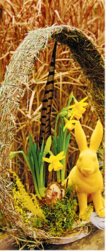 Hier benötigt man: Hasendraht, Heu, Wickeldraht, eine Baumscheibe, Äste und Zweige, Frühlingsblüher, Federn, Gräser und Mimosen Ein ca. 1,2 Meter langes Stück Hasendraht wird von der Längsseite her gefaltet. Der entstandene Zwischenraum wird mit Heu gefüllt. Darauf achten, dass alles schön gleichmäßig flach gefüllt wird, insbesondere die Kanten. Die offenen Seiten werden mit einem längeren Drahtstück zugenäht. Um ausreichend Stabilität zu erhalten, wird das gefüllte Teil nochmals gefaltet und vernäht. Nun erhält man einen stabilen, gut formbaren Heustreifen. Die Mitte wird leicht angefaltet und dann die Rundungen zu einer Eiform zurechtgebogen. Mit dem Heißkleber die Enden übereinanderkleben und an einer kleinen Holzlatte oder Baumscheibe...