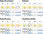 Der Samstag wird sonnig bis leicht bewölkt. Die Temperaturen liegen bei bis zu 25°C im Rheintal, 26°C im Neckarraum und 21°C auf der Alb. Am Sonntag frischt der Wind aus Osten auf und es zieht leichte bis mäßige Bewölkung auf. Zwischenzeitlich muss mit lokalen Gewitterschauern gerechnet werden. Die Temperaturen liegen bei bis zu 23°C im Rheintal, 24°C im Neckarraum und 20°C auf der Alb. Der Montag wird meist leicht bewölkt. Das Thermometer zeigt bis zu 22°C in den Ebenen und 15°C auf der Alb. Der Dienstag wird voraussichtlich sonnig bis leicht bewölkt. Die Temperaturen betragen bis zu 20°C in den Ebenen und 13°C auf der Alb. Die Folgetage werden voraussichtlich sehr sonnig bei ähnlichen Temperaturen. | →Das detaillierte Agrarwetter...