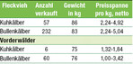 Am 4. Dezember fand die RBW-Kälberauktion in Donaueschingen statt. Im Angebot standen 375 Kälber. Die Preise zeigten sich über alle Kategorien stabil. Das kleinere Angebot an Vorderwälder-Kuhkälber wurde gut aufgenommen. Bei den Vorderwälder-Bullenkälbern wurden passende Kälber zügig abgesetzt. Bei den Fleckvieh-Kuhkälbern war die Qualität sehr gut. Ein Mahango-Kuhkalb knackte die 600-Euro-Marke. Gute Bullenkälber kosteten wieder bis zu fünf Euro pro kg.