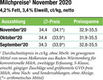 Der BWagrar-Milchpreis für konventionelle Milch blieb im November gegenüber Oktober unverändert bei 34,4 Cent pro kg. Im a rithmetischen Mittel hat sich der Preis sogar um 0,2 Cent erhöht. Der Kieler Rohstoffwert ist im November leicht um 0,1 Cent/kg auf 31,6 Cent/kg gestiegen. Der BWagrar-Biomilchpreis erhöhte sich um 0,2 Cent auf 51,2 Cent (gewichtet) und im a rithmetischen Mittel um 0,4 Cent auf 49,1 Cent pro kg. Damit zeigen sich die Bio preise weiterhin gefestigt. Nach Angaben des Verbandes der Milcherzeuger Bayern e. V. (VMB) hat die Milcherzeugung ihren saisonalen Tiefstand durchschritten. Das saisonale Anlieferungsniveau steigt wieder an und die Absatzentwicklung verläuft positiv. Wegen Corona hält die Marktverschiebung hin in...
