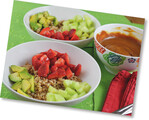 Zubereitung Dinkelreis in Salzwasser nach Packungsanleitung zubereiten. Erdbeeren waschen, putzen und in mundgerechte Stücke schneiden. Gurke schälen und würfeln. Avocado halbieren, Stein entnehmen und würfeln. Zubereitung der Soße: Erdnussbutter mit übrigen Zutaten gut verrühren, soviel Wasser zugeben, bis eine dickflüssige Soße entsteht. Dinkelreis in größere Schalen (Bowls) mittig platzieren, Obst und Gemüse seitlich darauf geben. Die Soße wird für alle auf den Tisch gestellt, damit sich jeder bedienen kann. Tipp: Wer die Erdnuss-Soße nicht mag, verwendet einfach sein Lieblings-Salatdressing. Fleischliebhabern machen wir mit ein paar gebratenen Putenstreifen dazu eine Freude. Zutaten 1 Beutel Dinkelreis (125 g) 250 g Erdbeeren | 1...