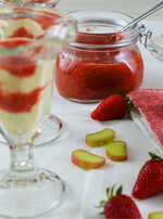 Zubereitung Erdbeeren und Rhabarber waschen und putzen. Erdbeeren vierteln, Rhabarber in ½ cm dicke Stücke schneiden. Rhabarber, Wasser, Zucker und Zitronensaft im Topf mischen und ca. 10 Minuten köcheln lassen. Wenn die Rhabarberstücke weich sind, 2 EL vom Sud abnehmen, das Vanillepulver zugeben und darin glattrühren. Erdbeeren, ausgekratzte Vanille untermischen und das aufgelöste Vanillepuddingpulver unterrühren. Für weitere 5 Minuten bei geringer Hitze aufkochen. Das noch heiße Kompott in zuvor heiß ausgespülte Einmachgläser füllen und gleich verschließen. Es hält an einem dunklen, kühlen Ort etwa ein halbes Jahr. Ein angebrochenes Glas hält sich im Kühlschrank einige Tage frisch. Tipp: Abwechselnde Schichten Grießbrei und Kompott in...