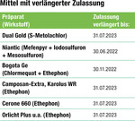 Das Bundesamt für Verbraucherschutz und Lebensmittelsicherheit (BVL) hat die Zulassung von Pflanzenschutzmitteln, deren Zulassung durch Zeitablauf endete, verlängert (siehe Tabelle). | Dr. Friedrich Merz, Pflanzenschutzdienst am Regierungspräsidium Stuttgart