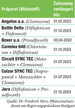 Das Bundesamt für Verbraucherschutz und Lebensmittelsicherheit hat die Zulassung von Pflanzenschutzmitteln, deren Zulassung durch Zeitablauf endete, verlängert. Die Zulassungsverlängerungen werden bis zur endgültigen Entscheidung über eine erneute Zulassung erteilt. | Dr. Friedrich Merz, Pflanzenschutzdienst am Regierungspräsidium Stuttgart Mehr zum Thema finden Sie auf www.bwagrar.de > Pflanzenbau.