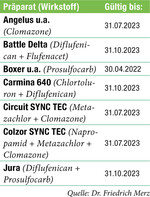 Das BVL hat die Zulassung von Pflanzenschutzmitteln, deren Zulassung durch Zeitablauf endete, verlängert. Die Zulassungsverlängerungen werden bis zur endgültigen Entscheidung über eine erneute Zulassung erteilt. | Dr. Friedrich Merz, Pflanzenschutzdienst am Regierungspräsidium Stuttgart