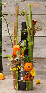 Eine gute Flasche Wein ist immer ein schönes Geschenk, sei es zum Geburtstag oder als Gastgeschenk. Doch floral verpackt, ist sie nochmal so viel wert und bleibt garantiert in Erinnerung. Am unteren Drittel und in der Mitte der Flasche befestigt man relativ stramm einen Gummiring. Zwischen Flasche und Gummi werden einige zugeschnittene Stangen einfach eingeklemmt. Die Hagebuttenranken sowie Früchte, die schön trocknen, eignen sich ebenso. Trockene Blüten wie zum Beispiel die Strohblümchen können mit der Heißklebepistole aufgeklebt werden. Möchte man eine frische Blüte integrieren, kann man ein mit Wasser gefülltes Reagenzglas mit einarbeiten. Die Hohlkammern der Stiele bieten sich geradezu dazu an, dass man ein Glas hineinstellt. Kleine...