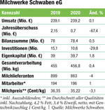 Bei den Milchwerke Schwaben eG haben sich die Umsatzerlöse 2020 leicht um 0,1 Mio. auf 239,2 Mio. Euro im Vergleich zum Vorjahr erhöht. Der Jahresüberschuss beläuft sich auf 0,7 Mio. Euro.
