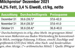 Im Dezember hat sich der gewichtete monatliche BWagrar Durchschnittspreis für Milch von 39,4 Cent um 0,2 Cent auf 39,6 Cent pro kg gegenüber November weiter erhöht. Damit liegt der Preis für konventionell erzeugte Milch im Dezember zwar weiterhin unter 40 Cent. Unter Berücksichtigung der Nachzahlungen für 2021 dürfte der Durchschnittspreis im Dezember die 40-Cent-Marke de facto zumindest erreicht, wenn nicht sogar schon überschritten haben. Bei der Biomilch blieb der gewichtete Durchschnittspreis im Dezember mit 54,6 Cent pro kg konstant gegenüber dem Vormonat. Der Kieler Rohstoffwert erhöhte sich um 2,3 Cent auf 52,4 Cent pro kg im Dezember. Die Molkereien erfassten laut Schnellberichterstattung der ZMB in der 51. Woche 0,6 Prozent und...