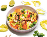 Zubereitung 1 EL Öl, Kurkuma und Cayennepfeffer in einen kleinen Topf geben und anschwitzen. Unter Rühren erhitzen und Kokosmilch hinzugießen. Bei mittlerer Hitze 3 Min. köcheln lassen. Salz und Agavensirup zugeben, ein paar Minuten weiterköcheln lassen, vom Herd nehmen, mit Limettensaft abschmecken und abkühlen lassen. Chinakohl putzen, waschen, trocken schleudern und quer in Streifen schneiden. Paprika vierteln, putzen, waschen, Kerngehäuse entfernen und ebenfalls in dünne Streifen schneiden. Möhre mit dem Sparschäler in feine Streifen hobeln und mit Chinakohl und Paprika vermengen. Anschließend das abgekühlte Dressing mit dem Salat vermischen. Koriander waschen, trocken schleudern und Blättchen von den Stielen zupfen. Tofu würfeln und...