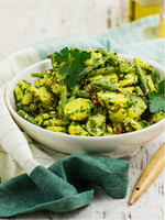 Zubereitung Kartoffeln waschen und in kochendem Salzwasser garen. Sobald ein Messer ohne Widerstand durchgleitet, sind sie durch. Abgießen und auskühlen lassen. Bohnen putzen und die Enden abschneiden. Anschließend in Salzwasser gar kochen, bis sie schön bissfest sind. Kartoffeln schälen, in Scheiben schneiden und in eine Salatschüssel geben. Bohnen halbieren und ebenfalls dazu geben. Zwiebel schälen und fein würfeln, dann zu Kartoffeln und Bohnen geben. Für das Dressing die Petersilie waschen, trocknen und die Blätter mit den Mandeln sehr klein hacken. Chili waschen, entkernen und hacken. Knoblauch ebenfalls schälen und hacken. Mit Olivenöl und Weißweinessig mischen und unter den Kartoffelsalat heben. Mit Salz und Pfeffer abschmecken....
