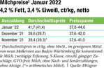 Im Januar hat sich der gewichtete monatliche BWagrar Durchschnittspreis für Milch von 39,6 Cent pro kg im Dezember auf 41,7 Euro pro kg deutlich um fast zwei Cent weiter erhöht. Im arithmetischen Mittel liegt der Preis im Januar bei 41,4 Cent pro kg gegenüber 39,7 Cent noch im Dezember. Damit hat der BWagrar Milchpreis die 40-Cent-Marke deutlich überschritten und folgt dem Trend der Preissteigerungen bei Agrarrohstoffen. Entsprechend erhöhte sich hier der Kieler Rohstoffwert mit den Bewertungen von Butter und Magermilchpulver im Januar um 1,9 Cent/kg auf 54,3 Cent pro kg. Hier zeigt sich, wie knapp die Milch derzeit am Markt ist. Entsprechend sind die Preise für flüssigen Rohstoff - für Rohmilch, Magermilchkonzentrat und Industrierahm -...