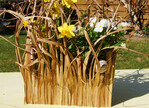 Hierfür benötigt man ein schmales Holz – oder Kunststoffgefäß, Gräser, doppelseitiges Klebeband, einen Plastikbeutel, Pflanzen nach Wunsch sowie trockene Gräser. Die Herstellung ist sehr simpel und obendrein kostengünstig. Um das rechteckige Gefäß herum wird doppelseitiges Klebeband angebracht. Nach und nach werden der obere Teil des Bandes abgezogen und die trockenen Blätter senkrecht- mit der Spitze nach oben - aufgeklebt. Es ist darauf zu achten, dass die Gräser schön dicht aneinandergeklebt werden, damit keine Zwischenräume und das Klebeband sichtbar bleiben. Ist das Gefäß rundherum bestückt, können eventuelle Lücken mit weiteren Gräsern ergänzt werden. Diese werden dann am besten mit einer Heißklebepistole befestigt. Hierbei darauf...