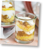 Zutaten (vier Dessertgläser) Für den Biskuit 2 Eier, 50 g Zucker, 70 g Mehl und 2 g Backpulver. Für das Rhabarber-Kompott 300 g Rhabarber, 40 ml Traubensaft, 60 g Zucker und 1 TL Vanilleextrakt. Außerdem 150 g griechischer Joghurt. Zubereitung Eier trennen. Das Eiweiß steif schlagen, dabei nach und nach den Zucker zugeben. Einzeln die Eigelbe dazu rühren. Mehl und Backpulver vermischen und vorsichtig unterheben. Fertig ist der Biskuit-Teig. Den Biskuit etwa einen Zentimeter hoch auf ein Backpapier streichen und bei 180 Grad Ober-/Unterhitze für zwölf bis 15 Minuten backen. Dann direkt auf ein anderes Backpapier stürzen. Für etwa zehn Minuten auskühlen lassen. Rhabarber putzen. Obstsaft mit Zucker und Vanille aufkochen. Rhabarber dazugeben...