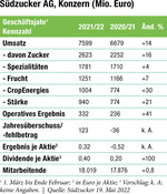 Der Südzuckerkonzern steigerte im Geschäftsjahr 2021/22 den Umsatz um 920 Mio. Euro auf 7,6 (Vorjahr: 6,7) Mrd. Euro. Alle fünf Geschäftssegmente trugen dazu bei. Neue Marktchancen sieht die Unternehmensgruppe mit Proteinen und biobasierten Chemikalien wie Ethanol.