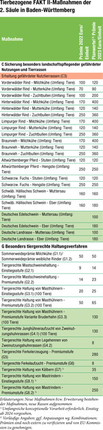 Tierschutz und artgerechte Tierhaltung als gesamtgesellschaftliche Aufgabe sind ein politischer Schwerpunkt der Landesregierung. Daher wird dem Tierwohl als zentraler Fördertatbestand ab 2023 auch in FAKT II eine besondere Bedeutung beigemessen. Zu den tierbezogenen Teilmaßnahmen von FAKT II gehören zum einen die Erhaltung gefährdeter Nutztierrassen und zum anderen Maßnahmen, die dem Tierwohl dienen. Bei den gefährdeten Nutztierrassen sind fünfjährige Verpflichtungen einzugehen, Maßnahmen für mehr Tierwohl sind mindestens einjährig. Unter Vorbehalt der Genehmigung des nationalen GAP-Strategieplans für Deutschland durch die EU-Kommission sollen ab 2023 in FAKT II die der Tabelle aufgeführten, tierbezogenen Teilmaßnahmen angeboten werden....