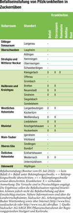 Auch wenn es sehr heiß und trocken erscheint auf unseren Zuckerrübenfeldern, so fallen doch immer wieder Niederschläge im Einzugsgebiet der Fabrik Offenau. Zudem zeigt sich die kommende Wettervorhersage etwas wechselhafter mit höheren Temperaturen. Zwar liegen die Temperaturen teilweise im Tagesverlauf über dem Idealbereich (20 bis 25°C) einer Vermehrung von Cercospora, dennoch ist ein leichter Anstieg des Blattkrankheitendrucks in einigen Regionen sichtbar. Schwelle überschritten In der Region Rheintal wurde diese Woche an einem Boniturstandort die aktuelle Schadschwelle von fünf Prozent Befallshäufigkeit überschritten. Es erfolgt daher für diese Region ein Warnaufruf zur Kontrolle der Zuckerrübenbestände. Um den Befall im eigenen...