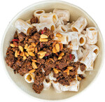 Zutaten (zwei Portionen) 200 g Rinderhackfleisch 200 g Pasta 10 0 g griechischer Naturjoghurt 1 Schalotte 1 Knoblauchzehe 1 EL Olivenöl 1 EL Tomatenmark 1/2 rote Chilischote 1 TL Garam Masala 1 TL Pul Biber (Gewürzmischung mit Paprika und Chili 1/2 TL Zimt 20 g Butter 20 g Pinienkerne Zubereitung Butter in einer großen warmen Pfanne schmelzen. Pinienkerne darin anrösten, bis die Kerne gebräunt sind. In eine kleine Schale umfüllen. Die Pfanne kurz auswischen, darin wird gleich das Hackfleisch gegart. Nudelwasser zum Kochen bringen, salzen und die Pasta kochen. Schalotte schälen und in kleine Würfel schneiden. Chili waschen, Kerne entfernen und klein hacken. Olivenöl in der Pfanne erhitzen und Hackfleisch darin scharf anbraten, bis es...