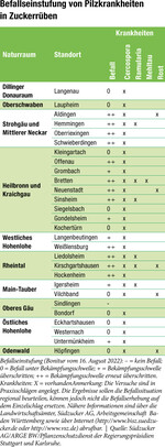 Im Laufe der vergangenen Wochen hat sich das Wetter kaum verändert. Wenig bis keine regionalen Niederschläge und sommerliche Temperaturen haben zur Folge, dass die Ausbreitung von Cercospora und Gelbfärbung sich in Grenzen halten. Allerdings kann eine kühlere Witterung kombiniert mit Niederschlägen – wie zum Wochenende angekündigt – die Situation der Blattkrankheiten ändern. Leider haben sich die Wettervorhersagen bezüglich Niederschlag als nicht sehr verlässlich erwiesen. Dennoch hoffen wir darauf, dass der langersehnte Regen kommt. Deshalb ist es weiterhin wichtig, die Schläge zu kontrollieren. Warnaufruf für Main-Tauber Ab dieser Woche (15. August) gilt die Schadschwelle bei einer Befallshäufigkeit von 45 Prozent befallener Blätter für...