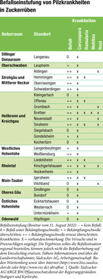 In dieser Woche sind nur einige wenige Standorte hinzugekommen, die die aktuelle Schwelle von 45 Prozent überschritten haben. Die Versuche der Arbeitsgemeinschaften zeigen, dass fungizide Behandlungen im September nicht mehr wirtschaftlich sind. Nur wenn die folgenden Kriterien zutreffen, kann eine Behandlung zum jetzigen Zeitpunkt noch abgewogen werden: Einteilung in Abfuhrrunde eins oder zwei und wann diese sein wird, dies lässt sich aus der im SZ-Rohstoffportal zur Verfügung stehenden Ladereihenfolge ableiten. Momentan kann von einer Kampagnedauer von Ende September/Anfang Oktober bis Anfang/Mitte Dezember ausgegangen werden. Ist der Blattapparat gut in Takt, einigermaßen vital und für Wirkstoffe aufnahmefähig? Zur Verhinderung von...