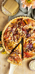 Zutaten (Springform, 24 cm) 150 g Mehl, 100 g weiche Butter, 90 g Zucker, 1 Eigelb, 1 TL Vanilleextrakt, 0,5 TL Zimt, 5 Äpfel, 100 g Marzipanrohmasse, 80 ml Apfelsaft, 40 ml Kirschlikör oder Kirschwasser, 40 g Mandeln Zubereitung Butter mit 40 g des Zuckers, Vanille und Eigelb verrühren. Mehl und eine Prise Salz hinzufügen und zu einem geschmeidigen Teig verkneten – er ist etwas klebrig. Abgedeckt für eine Stunde kaltstellen. Für die Apfel-Kirsch-Glasur das Kirschwasser mit Apfelsaft, restlichem Zucker und Zimt in einem kleinen Topf aufkochen. Nach drei bis vier Minuten entsteht ein Sirup, diesen abkühlen lassen. Wenn der Teig gekühlt ist, die Tarteform vorbereiten: Fetten und/oder mit Backpapier auslegen. Den Teig rund ausrollen und in...