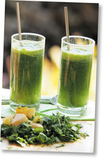 Das Fazit einer winterlichen Wildkräuterernte: Erstens gibt es viel mehr Wildkräuter zu ernten als erwartet. Und zweitens haben wir es in der Hand, in unseren Gärten und Balkonen für eine gute Ernte zu sorgen, indem wir Wintergemüse und Wildkräuter darin integrieren. So pfiffig gegärtnert, werden die Erntefreuden über den Winter erweitert – zugunsten des leckeren Geschmacks und für die Gesundheit, gerade in der kalten Jahreszeit. Zutaten: Brunnenkresse, Barbarakraut, Vogelmiere, Gartenschaumkraut, Wiesenknopf und Schafgarbe. Einige zarte Blättchen von Grünkohl, Radieschen, Mangold, Spinat und Asiasalaten. Einen halben Liter Apfelsaft und etwas kleingeschnittenes Obst wie Apfel oder Birne. Zubereitung: Wildkräuter und Wintergemüse waschen...