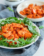 Zutaten für zwei Portionen 3 Karotten (ca. 350 g) 2 Zwiebeln 1 EL Harissa-Paste 1,5 EL Apfelessig 1,5 EL Sonnenblumenöl 0,25 TL Zucker 0,25 TL Kümmel eine Handvoll Rucola. Zubereitung Karotten schälen und am Stück in einem großen Topf mit Wasser zum Kochen bringen. Sobald das Wasser kocht, die Hitze reduzieren und mit geschlossenem Deckel für 20 Minuten garen. Zwiebeln schälen und klein hacken. Dann in einer Pfanne mit der Hälfte des Sonnenblumenöls anbraten, bis sie gebräunt sind. Karotten abgießen, etwas abkühlen lassen und dann in Scheiben schneiden – sie können ruhig einen halben Zentimeter dick sein. Harissa mit Kreuzkümmel, Schwarzkümmel, Zucker, Essig und dem restlichen Öl vermischen. Mit einer Prise Salz abschmecken und die...
