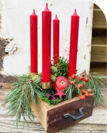 Eine etwas andere Variante des beliebten Adventskranzes bietet diese kleine Schublade. Zuerst schneidet man sich ein Brett zu, welches anschließend auf den Boden der Schublade passt. Dann zeichnet man ein Quadrat auf dieses Brett. An den vier Ecken dieses Quadrats werden Kerzentüllen ihren Platz finden, doch vorher bohren wir ein kleines Loch. Der Bohrer sollte die Maße der Kerzentüllenstifte haben, damit diese fest und stabil auf dem Brett stehen. Ansonsten mit etwas Kleber nachhelfen. Mit Moos wird die Schublade beziehungsweise das Brett ausgelegt. Kleine Zweige von Tanne, Kiefer und anderen Koniferen geben den frischen Charakter. Mit Zapfen und gesammelten Früchten wird locker und dezent geschmückt. Jetzt werden nur noch die Kerzen...
