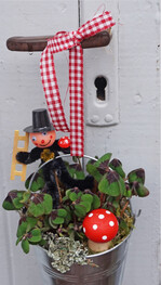 Was für eine nette Überraschung. Da hat jemand das Glück an die Tür gehängt! In die kleinen Blecheimerchen werden kleine Kleepflanzen gesetzt und mit etwas Moos und Flechten abgedeckt. Weitere Glücksbringer wie Schornsteinfeger und Pilze schmücken das kleine Arrangement. Mit einer kleinen Schleife wird der Glücksbringer an der Türe befestigt. Da kommt Freude auf.
