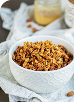 Zutaten 200 g grobe Haferflocken 100 g Mandeln 120 g Honig 50 ml Kokosöl oder Agavendicksaft etwas Zimt, etwas Vanille 1 Prise Salz Zubereitung Den Ofen auf 150 °C Ober-/Unterhitze vorheizen. Die Mandeln grob schneiden. In einer Schüssel alle Zutaten vermischen, bis jede Haferflocke von Mandel-Vanille-Aromen umhüllt ist. Auf einem mit Backpapier ausgelegten Backblech verteilen und für 20 bis 30 Minuten backen. Das Mandel-Granola sollte nicht zu braun werden. Nach zehn Minuten einmal umrühren und wenden. Nach dem Backen auskühlen lassen und dann ein wenig aufbrechen, abgedichtet, zum Beispiel in einem Glas, lagern. Zum Frühstück dann mit etwas Milch genießen.