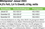 Am Milchmarkt zeigt sich seit Januar eine erste Schwächephase. So ist der BWagrar Milchpreis für konventionelle Milch im Januar gegenüber Dezember von im Schnitt 59 Cent pro kg auf 55,7 Cent pro kg (gewichtet) um 3,3 Cent zurückgegangen. Von den neun Molkereien im BWagrar-Vergleich haben fünf ihre Auszahlungspreise im Januar zurückgenommen, eine davon sogar im zweistelligen Cent-Bereich. Die anderen vier Molkereien hielten ihre Preise gegenüber Dezember noch unverändert. Der BWagrar Bio-Milchpreis gewichtet ist um 0,4 Cent auf 65,3 Cent und der arithmetische Preis um 0,8 Cent auf 61,5 Cent pro kg leicht gefallen. Und auch hier scheint die Vermarktung schwierig. Allein im Jahr 2022 ging der Absatz von Biomilch über den LEH deutschlandweit...