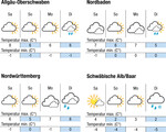 Die kommenden Tage wechseln sich Sonne und Wolken mit weiteren Schnee- und Regenfällen ab. Am Samstag kann sich zäher Hochnebel halten, gebietsweise kommt die Sonne durch. Die Temperaturen erreichen maximal 7°C im Rheintal, 6°C im Neckarraum und 4°C auf der Alb. Am Sonntag kann es gebietsweise auflockern bei Temperaturen von maximal 6°C im Rheintal, 5°C im Neckarraum und 2°C auf der Alb. Der Montag wird dicht bewölkt, die Temperaturen erreichen maximal 7°C in den Ebenen und 3°C auf der Alb. Der Dienstag bleibt meist bewölkt, gebietsweise kann es regnen, in Hochlagen auch schneien. Der Wind frischt auf und weht aus Norden. Die Temperaturen erreichen maximal 6°C in den Ebenen und 2°C auf der Alb. Die Folgetage werden voraussichtlich bewölkt...