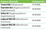 Für Diadem (Wirkstoffe: Fluxapyroxat + Mefentriflu conazol) wurde jetzt eine reguläre Zulassung gegen Cercospora-Blattflecken, Ramularia-Blattflecken, Rübenrost und Echten Mehltau in Zuckerrübe und Futterrübe erteilt. Das Mittel kann mit 1 l/ha in 150 bis 400 l Wasser/ha gespritzt werden. Es sind maximal zwei Behandlungen im Abstand von 14 Tagen möglich. Wartezeit: 28 Tage. Das Bundesamt für Verbraucherschutz und Lebensmittelsicherheit hat die Zulassung von Pflanzenschutzmitteln, deren Zulassung durch Zeitablauf endete, verlängert. Die Zulassungsverlängerungen werden bis zur endgültigen Entscheidung über eine erneute Zulassung erteilt. | Dr. Friedrich Merz, Regierungspräsidium Stuttgart