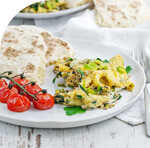 Zutaten (2 Portionen) 150 g Mehl 125 g Joghurt 1 TL Backpulver 1 EL Sesamsamen 2 EL Butter 4 Eier 1/2 Bund Petersilie oder Koriander 2 Frühlingszwiebeln 1 grüne Chilischote 1 TL schwarzer Kümmel 1 TL Garam Masala (indische Gewürzmischung, im Supermarkt erhältlich) 12 Rispentomaten und etwas Olivenöl Zubereitung Backofen auf 170 °C Ober-/Unterhitze vorheizen. Rispentomaten in eine Auflaufform legen, mit Olivenöl beträufeln und mit etwas Salz würzen. Für 20 Minuten im Ofen rösten, bis die Früchte schön aufplatzen. Für das Pfannenbrot Mehl mit Backpulver, Joghurt, Sesam und einer Prise Salz verkneten. Das ergibt einen ziemlich elastischen Teig. Am besten formt man daraus zwei je etwa einen Zentimeter dicke Fladen und gibt sie ohne Fett in...
