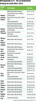 Die Anzahl der bei den Winterungen gezogenen Bodenproben ist diese Woche mit rund 680 Proben deutlich geringer als vergangene Woche. Die durchschnittlichen Werte der Winterungen liegen bei 29 kg Nitrat-N je ha bis 90 cm Bodentiefe und sind im Vergleich zur Vorwoche um 2 kg N je ha leicht angestiegen. Die Nitratgehalte verteilen sich folgendermaßen über die drei Schichten: 11 – 10 – 8 kg N je ha. Unter den geplanten und zum Teil bereits gesäten Sommerungen (ohne Mais) wurden insgesamt knapp 380 Proben gezogen. Der durchschnittliche Nitratgehalt beträgt hier 40 kg N je ha (Bodentiefe bis 60 cm). Die Verteilung des Nitratstickstoffs in den einzelnen Bodenschichten beträgt: 22 – 18 kg N je ha und hat sich im Vergleich zur Vorwoche um ein kg N...
