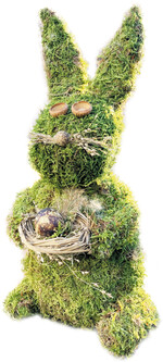Der Hase gehört einfach zu Ostern, und bei diesem Hasen ist ohne Moos einfach nix los. Was für ein toller natürlicher Werkstoff Moos ist, lässt sich hier gut erkennen. Sogar richtige Figuren lassen sich daraus gestalten. Die Materialliste ist überschaubar, denn es werden außer Moos nur Myrthendraht, Schaschlik-Spieße, ein paar Trockenblüten sowie Heißkleber benötigt. Zuerst werden aus Moos die einzelnen Körperteile wie Rumpf, Kopf, Arme, Beine und Ohren geformt. Erwägt man einen größeren Hasen zu basteln, können diese auch aus Zeitungspapier vorgeformt werden. So reduziert man den Verbrauch an Moos. Am besten startet man mit dem Körper. Das Moos beziehungsweise Papier wird zu einer großen Eiform zusammengedrückt und mit dünnem Wickeldraht...