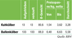 Mit nur 13 Kuhkälbern war das Angebot in diesem Segment am 12. April gering, so dass nicht jeder Kaufwunsch erfüllt werden konnte und sich der Preis aber im Gegensatz zum Vormonat etwas steigern konnte. Hier wäre ein größerer Auftrieb sicherlich wünschenswert gewesen. Der Nettosteigerungspreis konnte sich auf 3,28 Euro pro kg bei einem Schnittgewicht von 81 kg steigern. Die Bullenkälber konnten die anwesenden Käufer mit einer guten Qualität und einem relativ hohen Durchschnittsgewicht von 88 kg überzeugen. Jahreszeitlich bedingt geringer fiel auch das Angebot an männlichen Kälbern zur Mast aus. Genau dieses – landesweit – geringere Angebot konnte letztendlich den Preis deutlich beflügeln, so dass sich der Schnittpreis auf 5,58 Euro pro kg...
